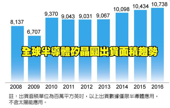 依據(jù)國(guó)際半導(dǎo)體產(chǎn)業(yè)協(xié)會(huì)(SEMI)旗下硅晶圓制造者部門SMG(Silicon Manufacturers Group)公布的年終硅晶圓產(chǎn)業(yè)分析報(bào)告顯示,2016年全球半導(dǎo)體硅晶圓出貨總面積達(dá)10,738百萬平方英吋,年成長(zhǎng)率達(dá)3%,連續(xù)3年創(chuàng)下出貨量歷史記錄新高。