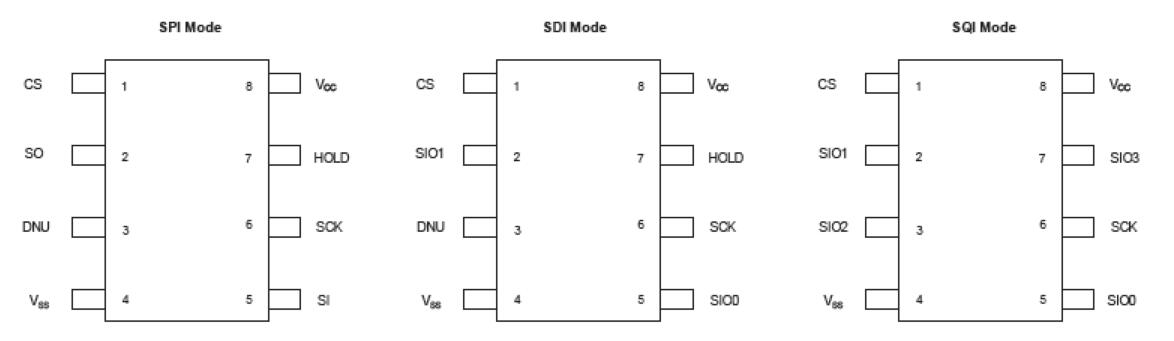 與兼容的主設(shè)備一起使用時(shí),該設(shè)備還支持SDI(串行雙接口)和SQI(串行四接口)操作模式。要進(jìn)入SDI模式,必須輸入ESDI命令(3Bh)。按照SDI操作模式的慣例,每個(gè)時(shí)鐘使用SIO0和SIO1引腳輸入兩位。位首先以MSB時(shí)鐘輸入。要進(jìn)入SQI模式,必須輸入ESQI命令(38h)。對(duì)于SQI操作模式,每個(gè)時(shí)鐘輸入4位數(shù)據(jù),或者每個(gè)時(shí)鐘輸入1個(gè)半字節(jié)。半字節(jié)首先由MSB提供時(shí)鐘。