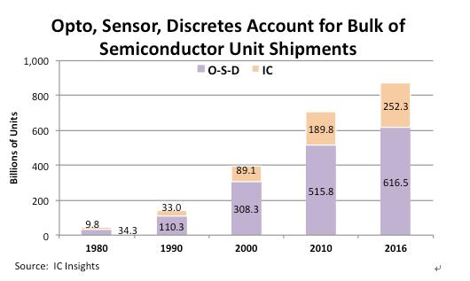 雖然集成電路技術(shù)不斷發(fā)展,越來越多的功能被集成到一顆存儲芯片中,從而以系統(tǒng)的角度來看用到的芯片數(shù)量越來越少,但I(xiàn)C Insights的統(tǒng)計(jì)結(jié)果顯示,全球半導(dǎo)體出貨量中,集成電路占比依然很低,而光電器件、傳感器與分立器件(Opto-Sensor-Discrete,簡稱O-S-D)的比重仍然超過七成。