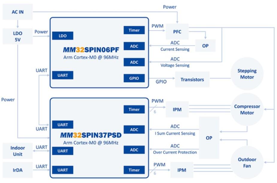 MM32SPIN06微控制器的空調(diào)外機(jī)方案如下圖所示,其中MM32SPIN37PSD(2個(gè)ArmCortex-M0內(nèi)核,最高主頻96MHz)和MM32SPIN06PF(基于ArmCortex-M0內(nèi)核的高性能32位微控制器,最高工作頻率可達(dá)96MHz)為主控制器。