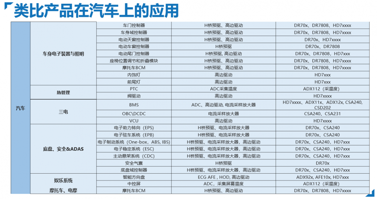 類比半導(dǎo)體高邊驅(qū)動產(chǎn)品可用于驅(qū)動車身控制域中的各種阻性、感性及容性負(fù)載的驅(qū)動,其在車內(nèi)外的應(yīng)用非常廣泛,包括車內(nèi)飾燈、頭尾燈、座椅和方向盤及后視鏡加熱、電磁閥、門鎖、電機(jī)等場景。