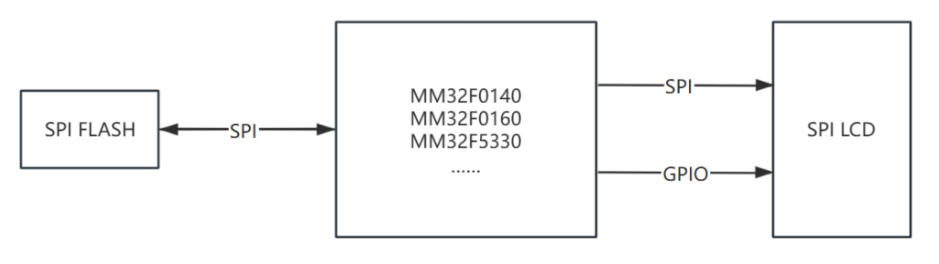 靈動(dòng)微推出的SPI LCD顯示參考方案,通過SPI接口讀取外部SPI FLASH存儲(chǔ)芯片中存儲(chǔ)的字體、圖片等數(shù)據(jù)資源,再通過另外一路SPI驅(qū)動(dòng)SPI LCD彩屏顯示。對于不同尺寸、不同分辨率的 SPI LCD 彩屏,客戶可以選擇靈動(dòng)微電子不同規(guī)格的MCU來實(shí)現(xiàn)刷屏效果,硬件設(shè)計(jì)框圖如下所示: