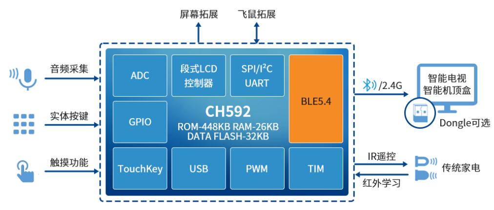 本方案基于沁恒CH592低功耗藍(lán)牙MCU,支持藍(lán)牙、2.4G和IR紅外遙控模式。遙控器可與電視機、機頂盒直連,也可通過配套的藍(lán)牙/2.4G Dongle建立連接。
