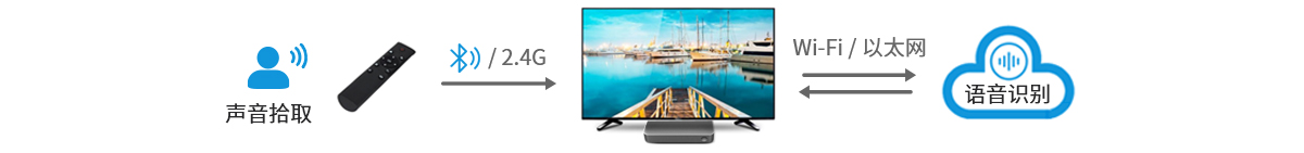 對于智能語音遙控器,用戶按下語音識別鍵后,遙控器告知電視啟動語音識別功能,同時拾取用戶語音,將音頻數(shù)據(jù)發(fā)送至電視,電視根據(jù)云端識別結(jié)果執(zhí)行節(jié)目搜索或打開相關(guān)應(yīng)用。