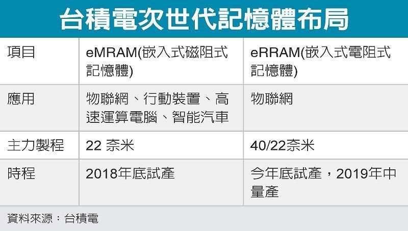 臺(tái)積電技術(shù)長(zhǎng)孫元成近日在臺(tái)積電技術(shù)論壇上,第一次披露臺(tái)積電研發(fā)多年的eMRAM(嵌入式磁阻式隨機(jī)存取內(nèi)存)和eRRAM(嵌入式電阻式內(nèi)存),分別定于明后年實(shí)行風(fēng)險(xiǎn)性試產(chǎn),主要使用22mn制程,這將是臺(tái)積電因應(yīng)高速運(yùn)算計(jì)算機(jī)、物聯(lián)網(wǎng)、行動(dòng)裝置和智能汽車等四領(lǐng)域所供給效能更迅速和耗電更低的新內(nèi)存。