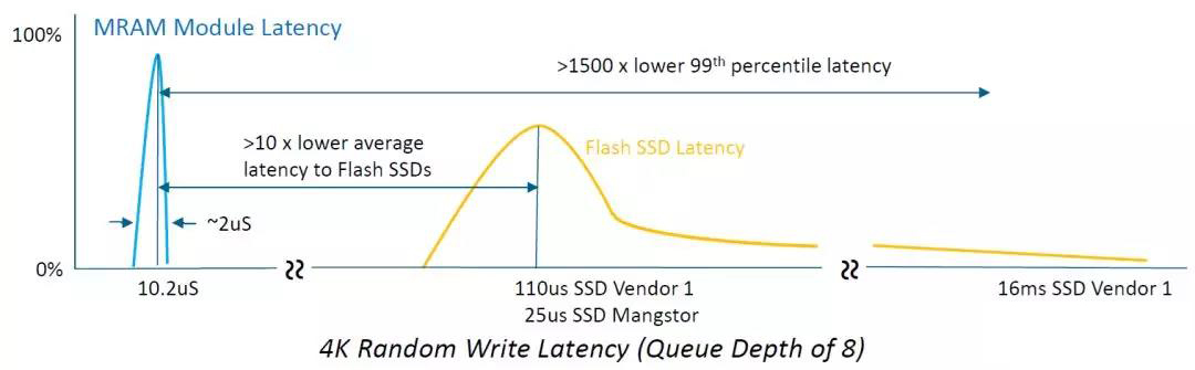 Everspin科技公司目前是全球第一家提供MRAM存儲芯片產(chǎn)品,目前推出最新款的產(chǎn)品STT-MRAM產(chǎn)品,單顆芯片容量可達(dá)32MB,可以做SSD固態(tài)硬盤的緩存綽綽有余,如下圖,MRAM的讀寫延遲只有10微秒左右,而且在命令很多的情況下,延遲QoS非常穩(wěn)定,波動在2微秒之內(nèi)。而SSD的延遲在100微秒,同時命令多了之后,延遲更長。