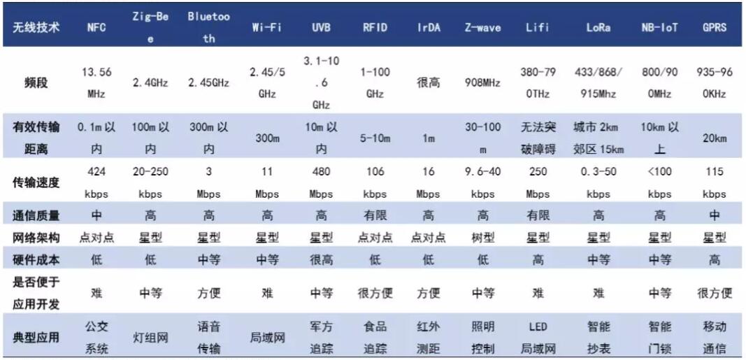 無線通信技術(shù)主要分廣域網(wǎng)和局域網(wǎng)兩種,具體差別在傳輸距離和通信協(xié)議方面。局域網(wǎng)無線通信技術(shù)包括、WIFI、藍(lán)牙、ZigBee、UWB、RFID、LiFi等,傳輸一般在0-300米;廣域網(wǎng)無線通信技術(shù)包括GPRS、LoRa、NB-IoT等,有效傳輸距離在公里級。藍(lán)牙是最主要的局域網(wǎng)(短距離)無線通信方式之一,適合覆蓋距離在百米以內(nèi)、數(shù)據(jù)傳輸量較小的通信。