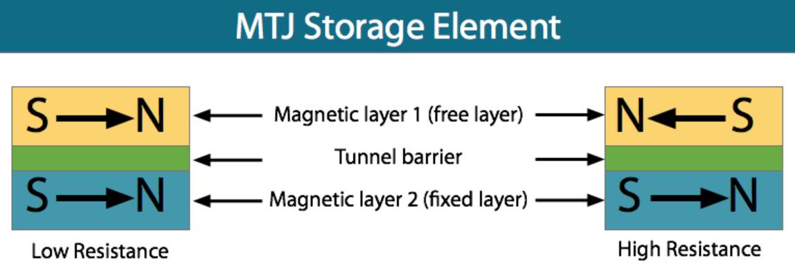 EVERSPIN MRAM產(chǎn)品采用一個(gè)晶體管,一個(gè)磁隧道結(jié)(MTJ)存儲(chǔ)單元作為存儲(chǔ)元件。MTJ由固定的磁性層,薄的電介質(zhì)隧道勢(shì)壘和自由磁性層組成。當(dāng)對(duì)MTJ施加偏壓時(shí),被磁性層自旋極化的電子將通過稱為隧穿的過程穿過介質(zhì)阻擋層。