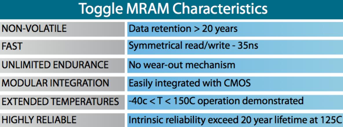 切換MRAM使用1個(gè)晶體管,1個(gè)MTJ單元來提供簡(jiǎn)單的高密度存儲(chǔ)器。Everspin使用獲得專利的Toggle電池設(shè)計(jì),可提供高可靠性。數(shù)據(jù)在溫度下20年始終是非易失性的。