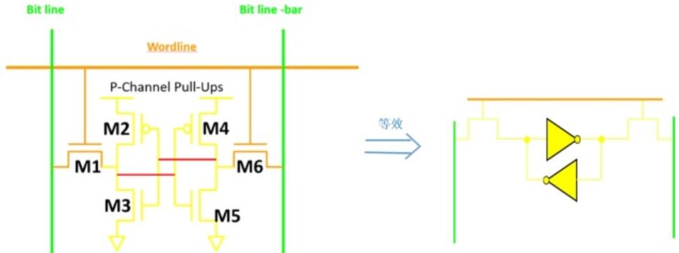 一個(gè)6T sram cell的經(jīng)典結(jié)構(gòu)如圖所示: