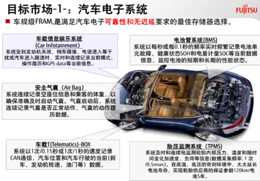 富士通FRAM早已能適用如汽車(chē)安全氣囊數(shù)據(jù)信息存儲(chǔ)(Airbag)、安全事故數(shù)據(jù)信息記錄軟件(EDR)、充電電池智能管理系統(tǒng)(BMS)、新能源汽車(chē)全車(chē)自動(dòng)控制系統(tǒng)(VCU),新能源汽車(chē)CAN小盒子(CAN-BOX)、新能源汽車(chē)載終端設(shè)備(T-BOX)、胎壓監(jiān)測(cè)裝置(TPMS)、車(chē)輛駕駛輔助系統(tǒng)軟件(ADAS)及導(dǎo)航欄與信息內(nèi)容車(chē)載多媒體(infotainment)等運(yùn)用中的即時(shí)且不斷的數(shù)據(jù)信息存儲(chǔ),所以能減少系統(tǒng)軟件復(fù)雜性并提升數(shù)據(jù)庫(kù)安全,。