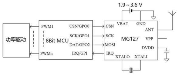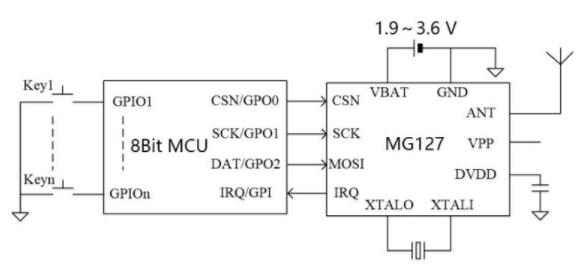 藍(lán)牙芯片MG127是具有低功耗、低成本的BLE 收發(fā)器,內(nèi)部集成了發(fā)射機(jī)、接收機(jī)、GFSK 調(diào)制解調(diào)器和BLE 基帶處理。電源電壓1.9~3.6,可以采用一個(gè)紐扣電池(3.0v)供電,具備3uA待機(jī)電流,20mA@0dBm持續(xù)發(fā)射,18mA持續(xù)接收等特點(diǎn)。MG127 采用DFN3x3 封裝,只需搭配低成本MCU 和少數(shù)外圍被動(dòng)器件,即可實(shí)現(xiàn)BLE 遙控、藍(lán)牙電子秤等應(yīng)用。