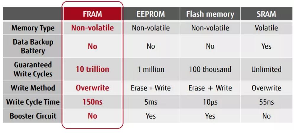 富士通FRAM主要具備三大優(yōu)勢:高讀寫入耐久性、高速寫入以及低功耗,這是絕大多數(shù)同類型存儲器無法比擬的。比如FRAM寫入次數(shù)壽命高達10萬億次,而EEPROM僅有百萬次(10^6)。富士通FRAM寫入數(shù)據(jù)可在150ns內(nèi)完成,速度約為EEPROM的1/30,000。寫入一個字節(jié)數(shù)據(jù)的功耗僅為150nJ,約為EEPROM的1/400,在電池供電應用中具有巨大的優(yōu)勢。