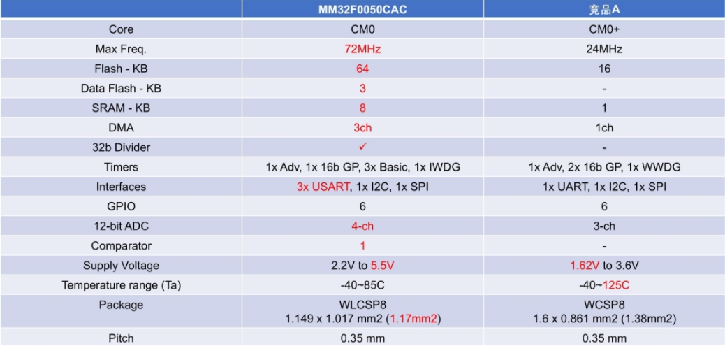 超小超值型單片機(jī)MM32F0050與競(jìng)品參數(shù)對(duì)比