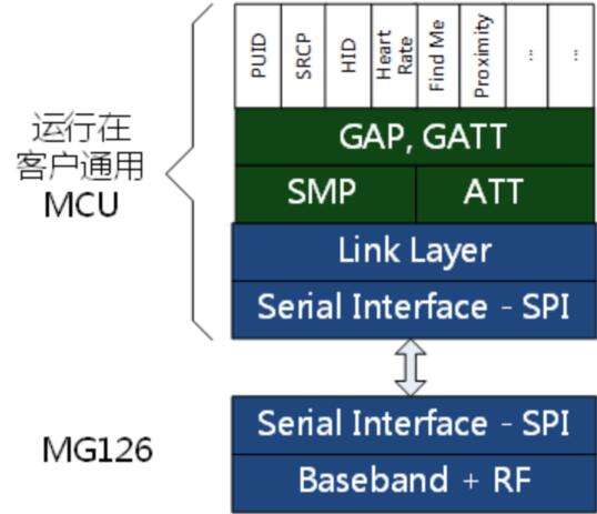 MG126使用獨創(chuàng)的創(chuàng)新架構(gòu)設(shè)計,采用常見的SPI通信接口,芯片本身不需要額外的喚醒信號已節(jié)省MCU IO資源。前端芯片包含RF和BLE數(shù)字基帶,完成BLE廣播和數(shù)據(jù)的接收/發(fā)送和調(diào)制/解調(diào)以及基帶數(shù)據(jù)轉(zhuǎn)換。BLE協(xié)議棧運行在MCU上,復(fù)用MCU強大的處理和控制能力,提高了MCU的資源利用率。該芯片采用QFN16封裝,體積只有3mmX3mm。