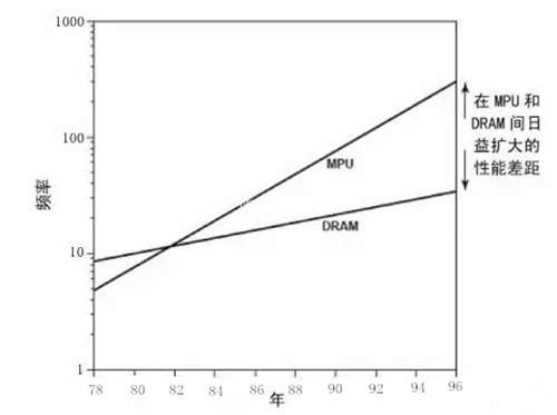 芯片集成度的不斷提升,給分立存儲(chǔ)器帶來了兩大挑戰(zhàn):首先:集成度和工藝開始允許片內(nèi)集成更多的存儲(chǔ)器;其次,存儲(chǔ)器的速度發(fā)展遠(yuǎn)遠(yuǎn)趕不上于MPU的速度,MPU速度以每年60%在成長,而存儲(chǔ)器只有10%。二者速度之間增長的差異巨大,如下圖所示。