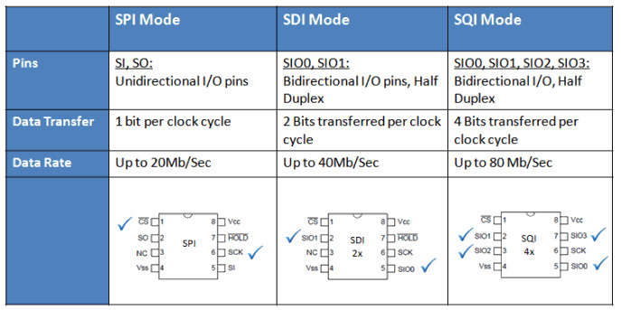 SQI模式下,全部4個(gè)引腳(引腳2、4、5和7)均配置為可隨時(shí)高效進(jìn)行讀或?qū)懖僮鳎_保在一個(gè)時(shí)鐘周期內(nèi)通過(guò)總線傳輸4位,這實(shí)際上會(huì)獲得4倍數(shù)據(jù)速率。例如,標(biāo)準(zhǔn)SPI模式下需花費(fèi)40個(gè)時(shí)鐘周期才能完成的任務(wù)現(xiàn)在可以在40/4 = 10個(gè)時(shí)鐘周期內(nèi)完成。 需要快速傳輸大量數(shù)據(jù)時(shí),該功能十分有用。